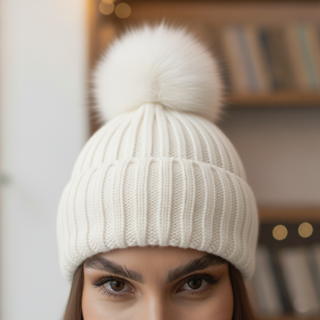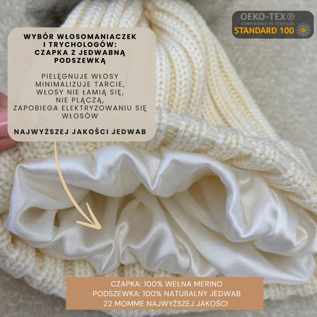 Czapka z jedwabną podszewką z pomponem ecru 100% wełna merino + 2 Gumki GRATIS