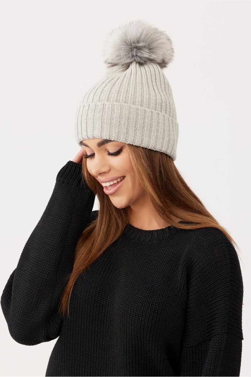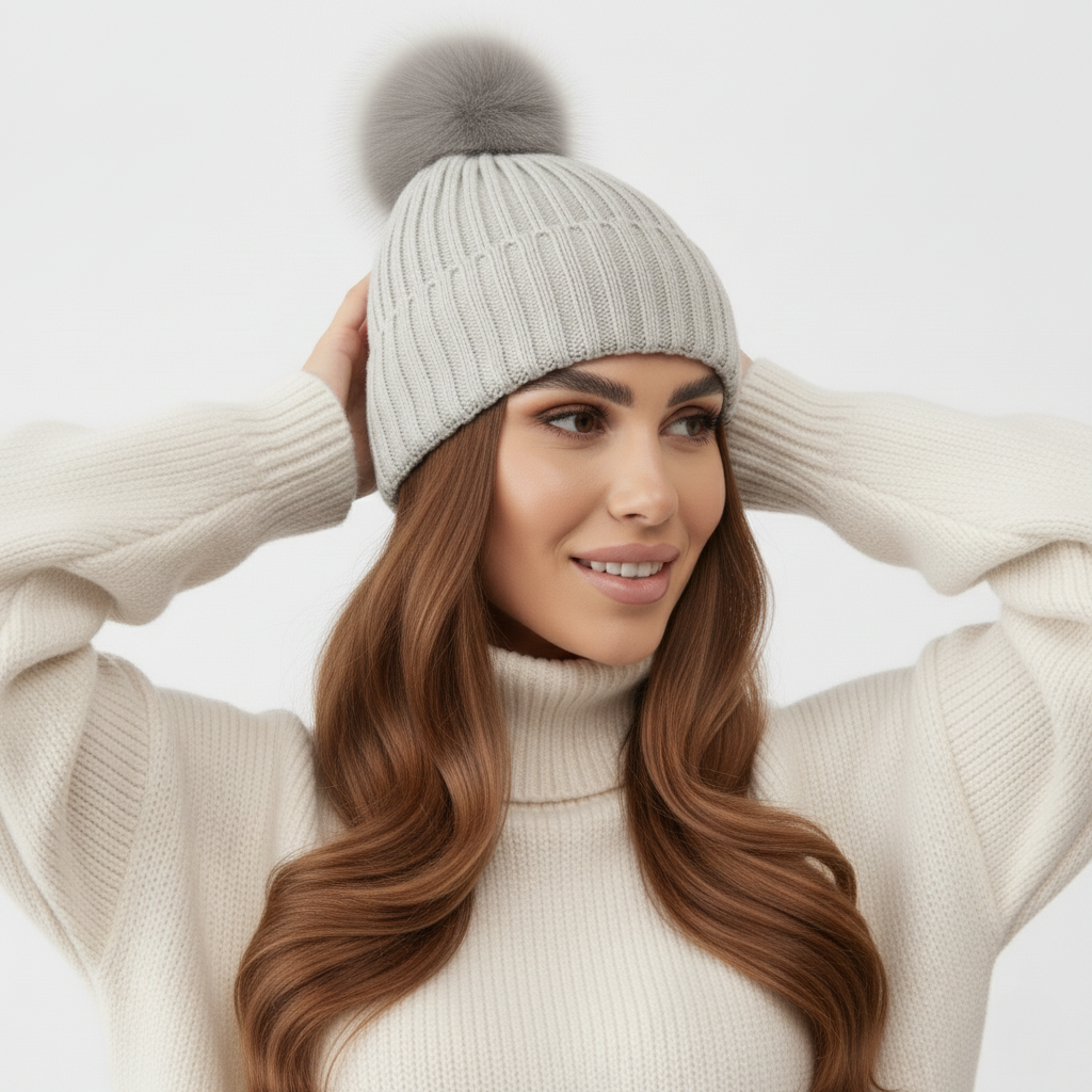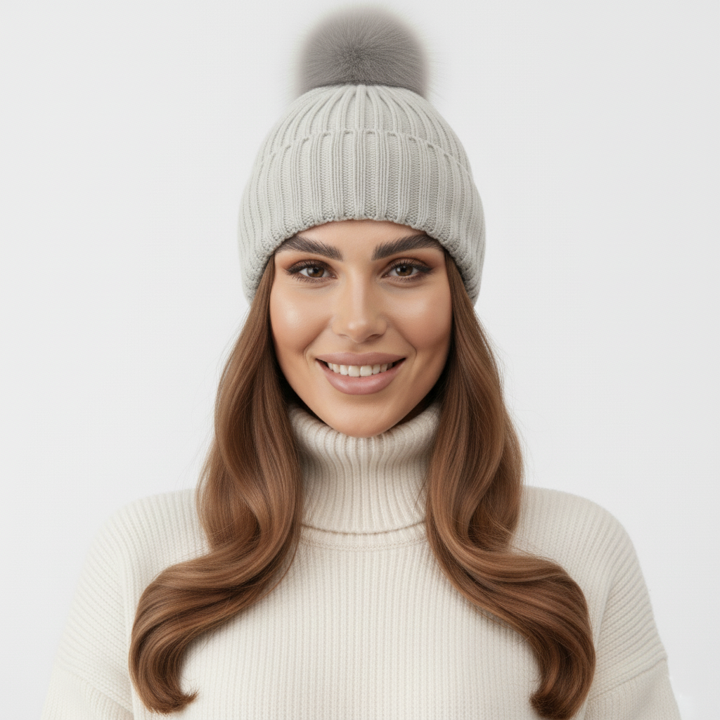 Czapka z jedwabną podszewką z pomponem szara 100% wełna merino + 2 Gumki GRATIS