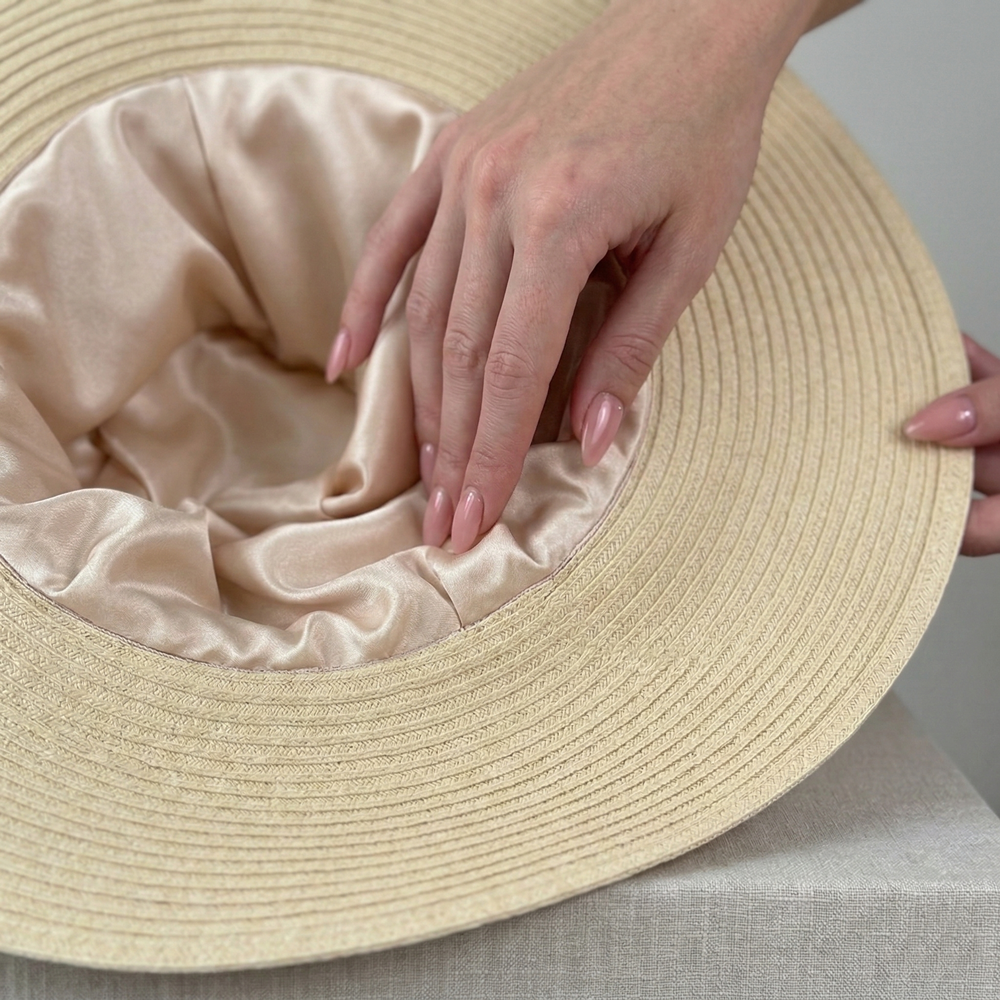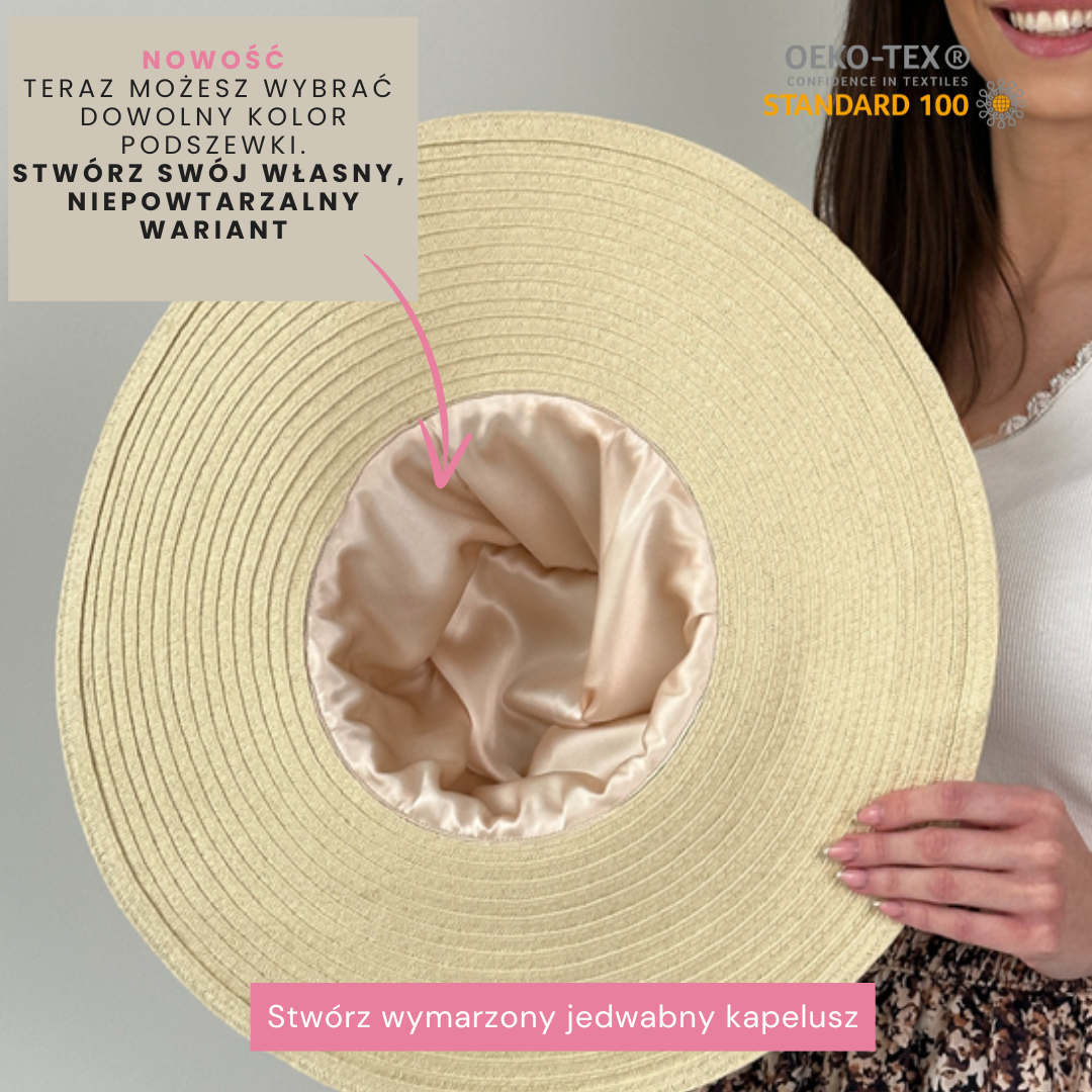Wewnątrz kapelusza zastosowaliśmy jedwab najwyższej jakości o gramaturze 22 Momme, który delikatnie otuli Twoją skórę, zapewniając uczucie wyjątkowej gładkości i delikatności. To idealne rozwiązanie, zwłaszcza na ciepłe dni, gdy dbamy o wygodę i przewiewność naszych akcesoriów.