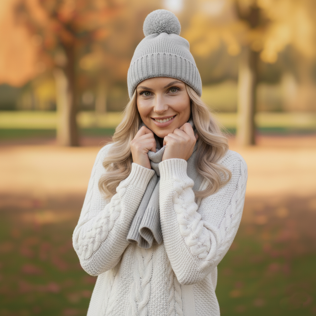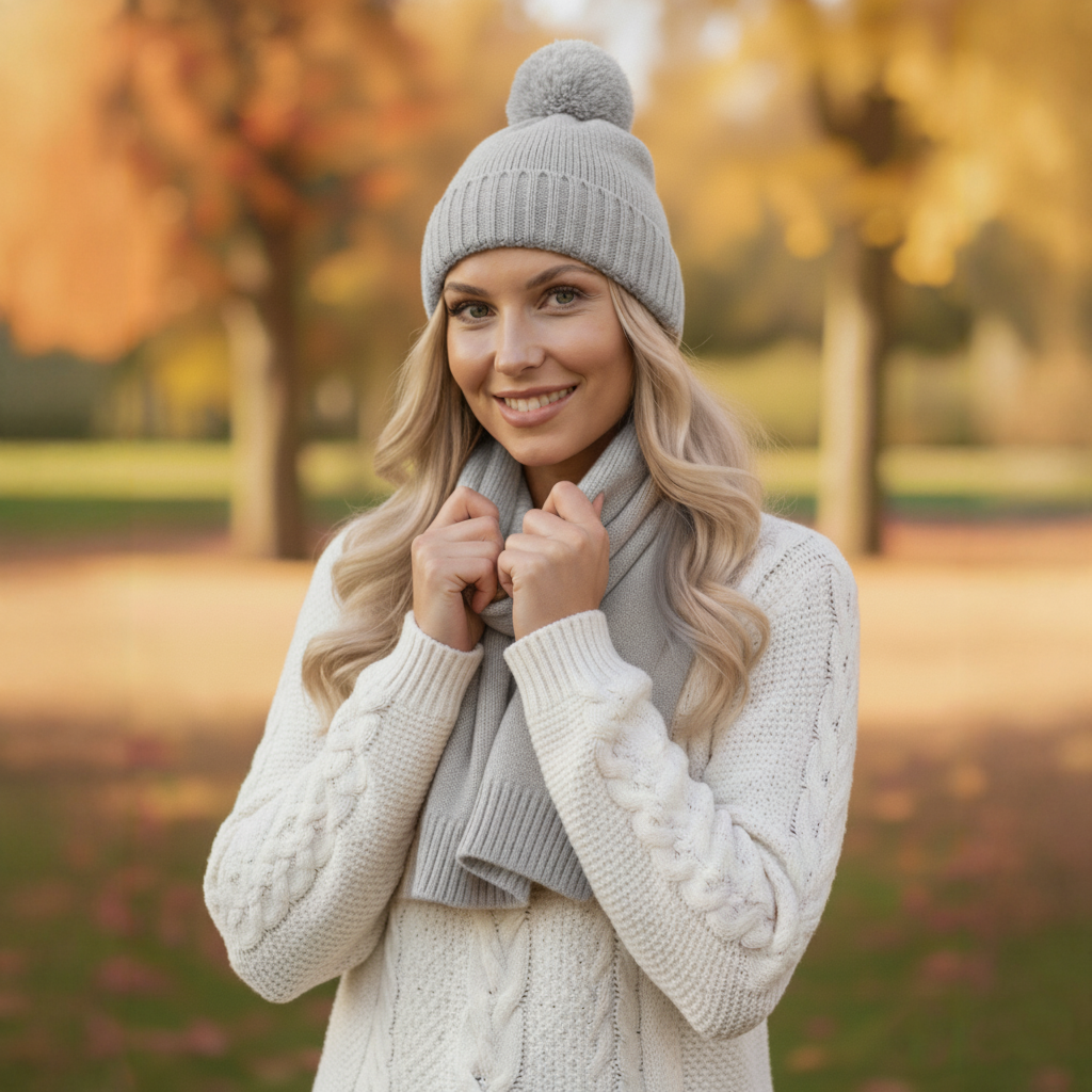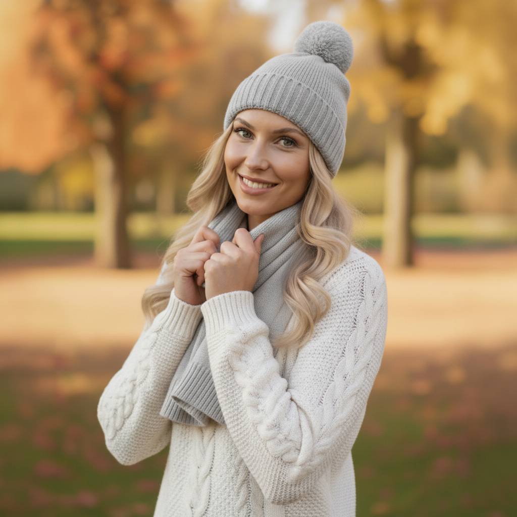 Komplet Czapka z jedwabną podszewką szary + szalik + 2 Gumki GRATIS